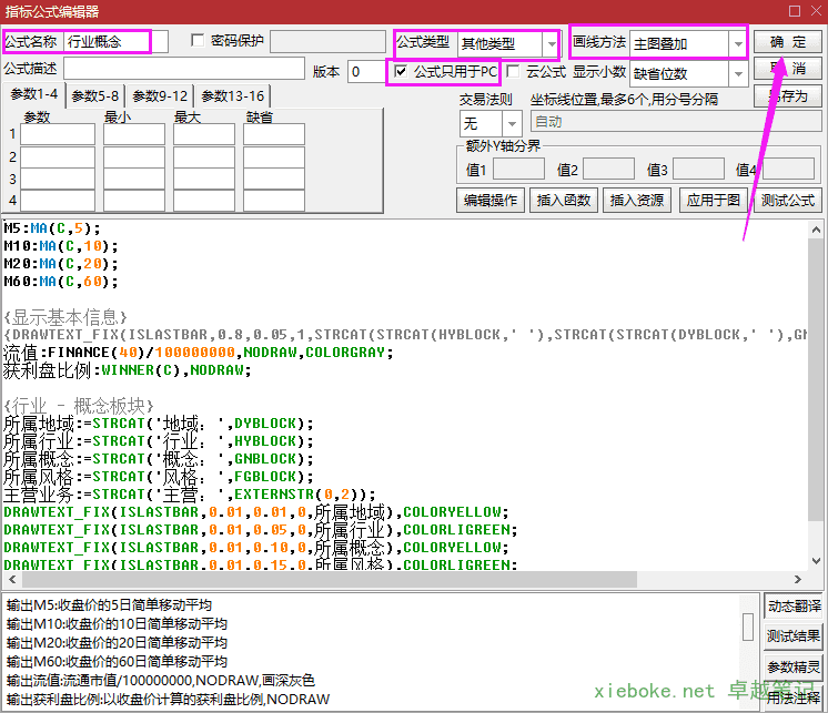 3. 把公式和代码粘贴进去,取个公式名称,然后选择“主图叠加”,直接点击“应用于图”,再点击“确定”就 ok 了
