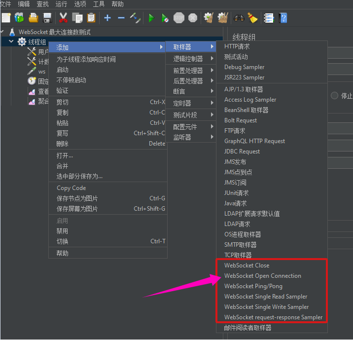 websocket-sampler-1.2.8.jar),放入 JMeter 的 lib/ext 目录,重启 JMeter。